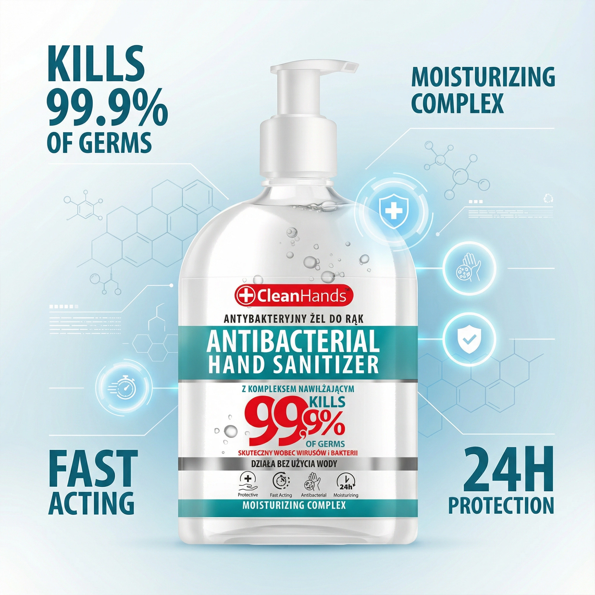 Antybakteryjny żel do dezynfekcji rąk – skutecznie eliminuje 99,9% bakterii bez użycia wody. Szybkie działanie, lekka formuła, efekt odświeżenia.