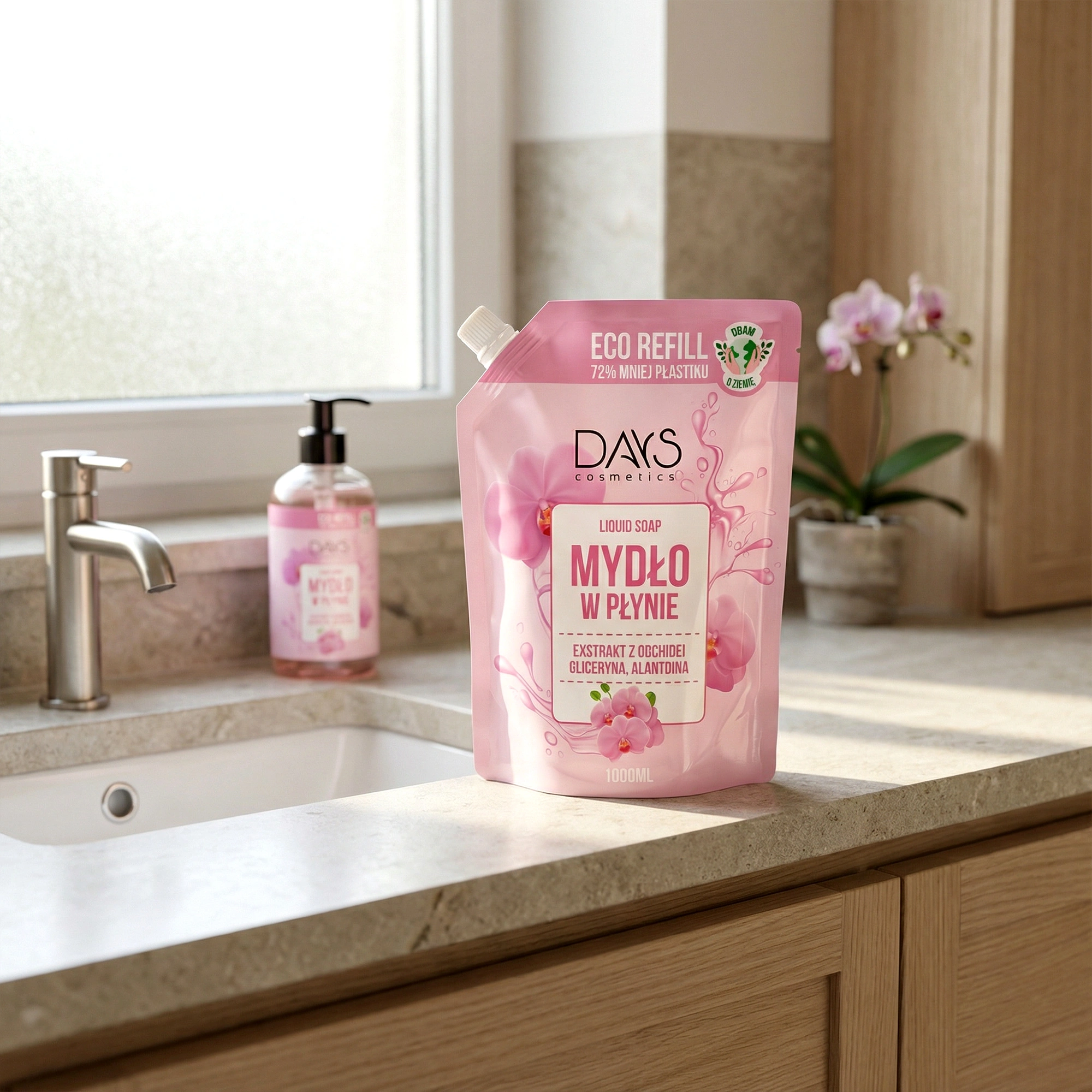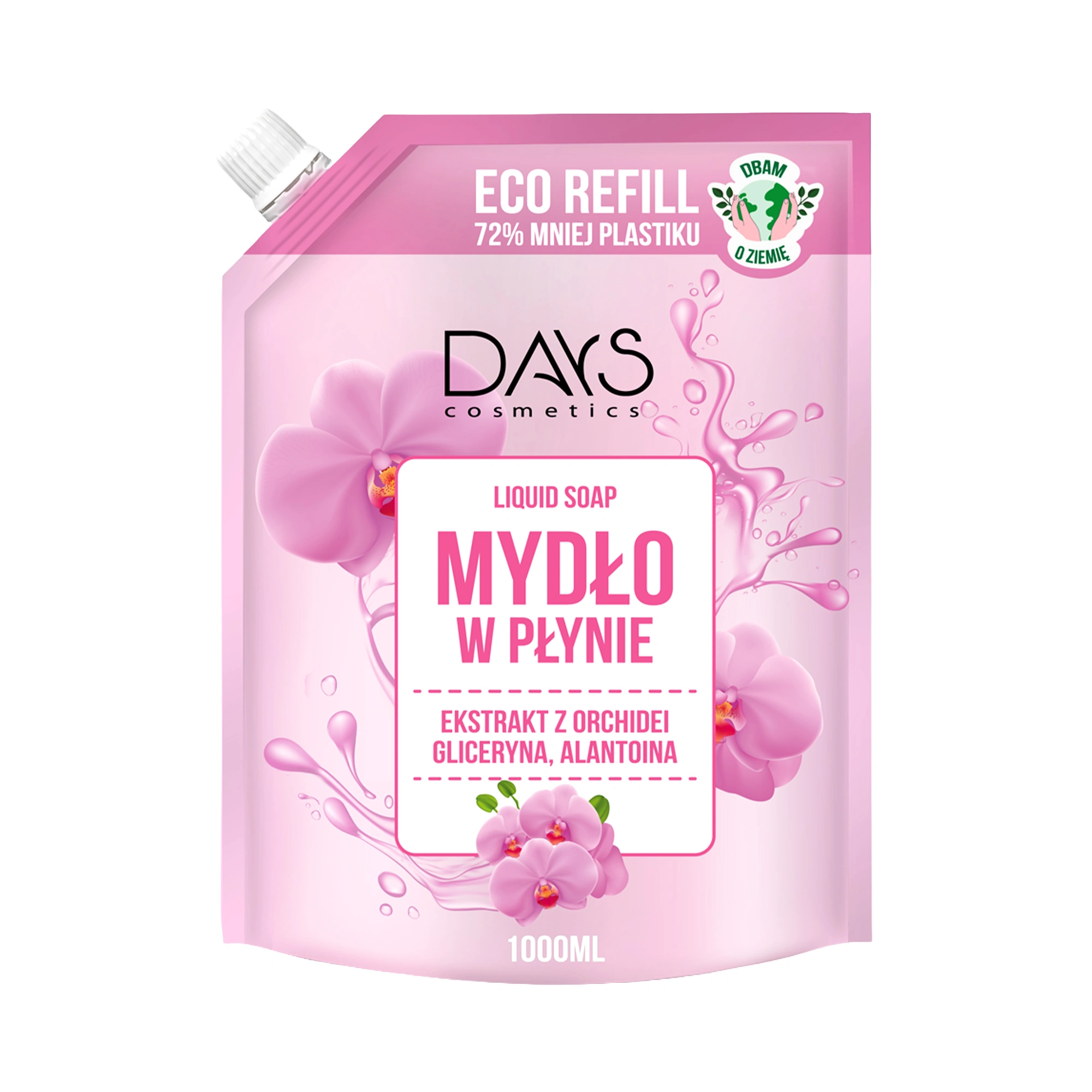 Mydło w płynie Days z ekstraktem z orchidei w litrowej butelce. Delikatna pielęgnacja i kwiatowa świeżość w ekonomicznym formacie.