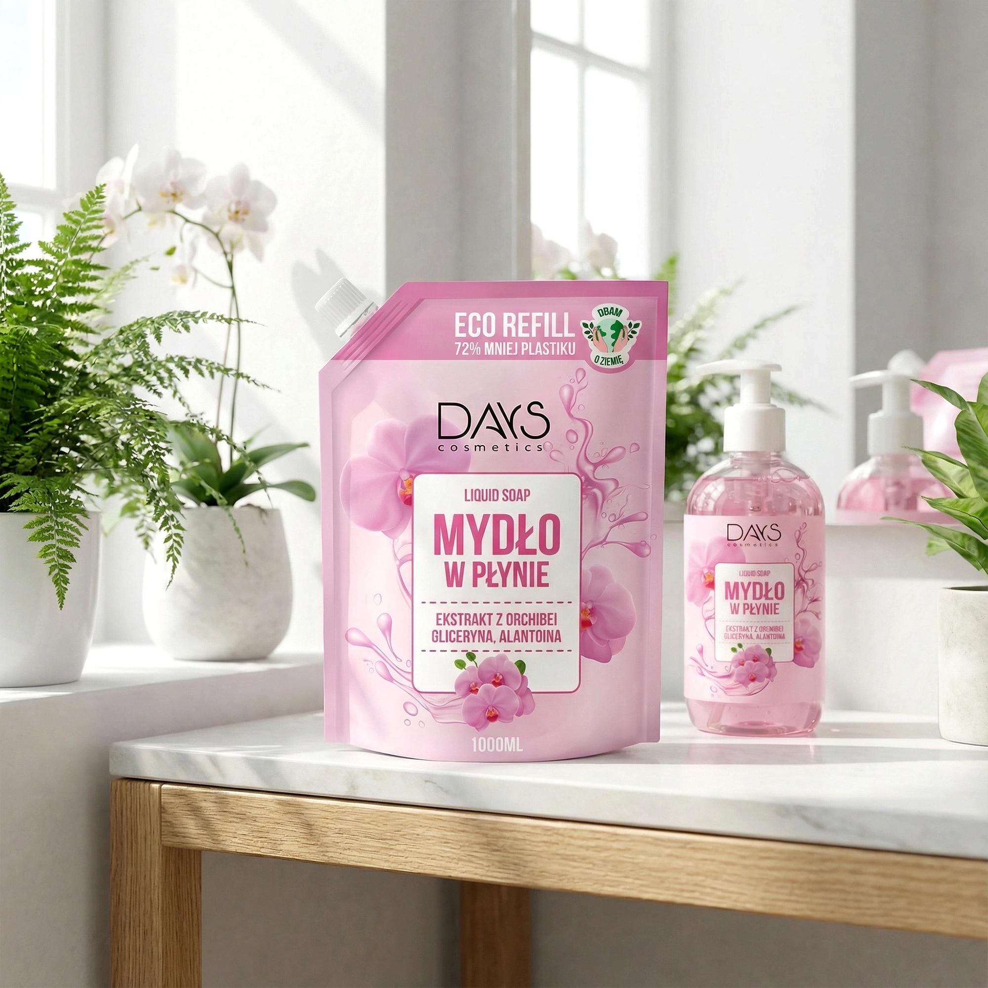 Mydło w płynie DAYS z ekstraktem z orchidei w litrowej butelce typu zapas to praktyczny wybór dla osób, które cenią naturalną pielęgnację i wydajność w jednym. Starannie opracowana formuła łączy skuteczne oczyszczanie z dobroczynnym działaniem ekstraktu z orchidei, gliceryny i alantoiny, zapewniając dłoniom miękkość, ukojenie i ochronę przed przesuszeniem.